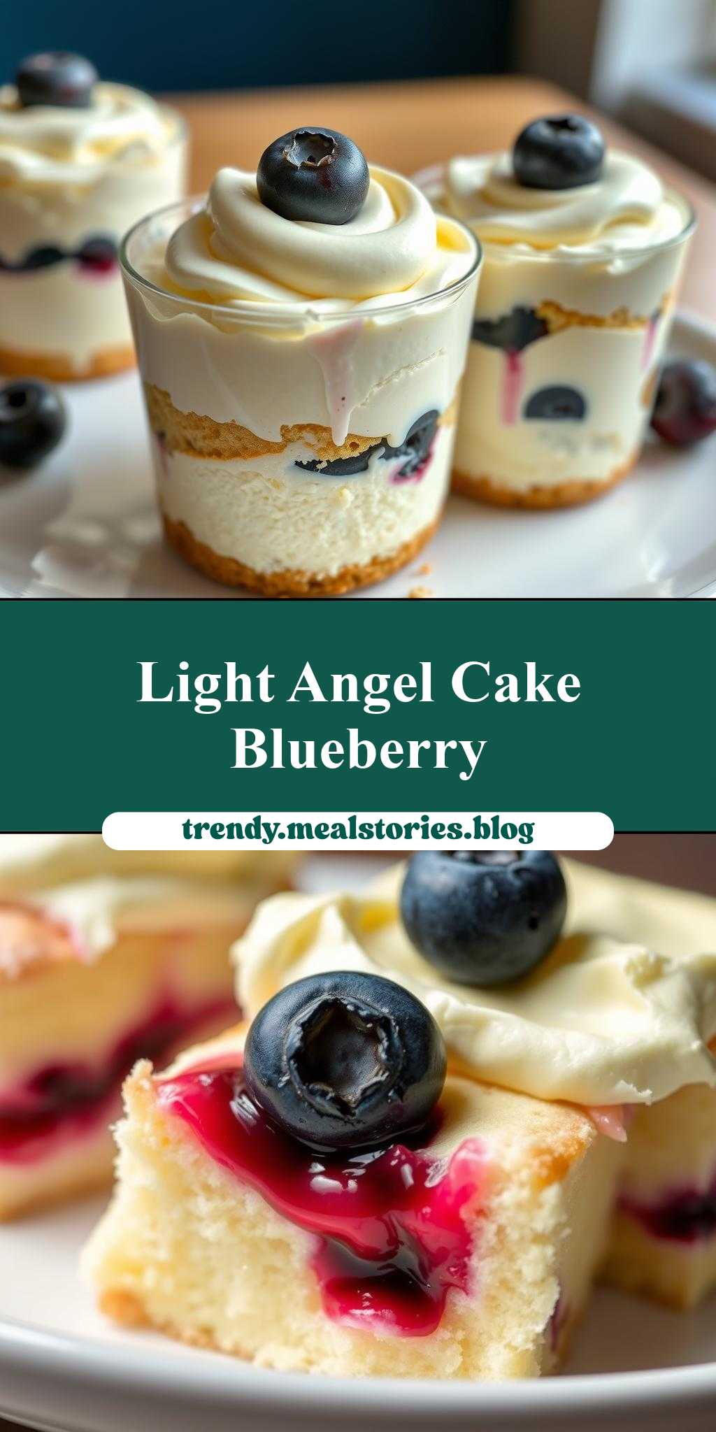 A layered dessert of angel food cake, cheesecake topping, and blueberries, perfect for any occasion with its ease of preparation and impressive presentation.