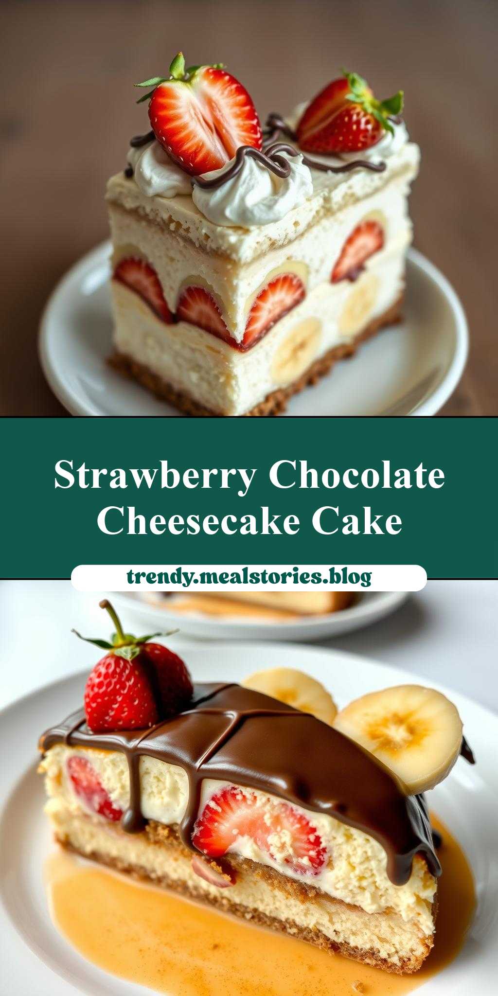 Two Pictures of a Banana Split Cheesecake Cake with Chocolate and Strawberries on Top